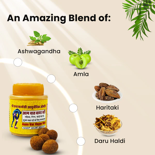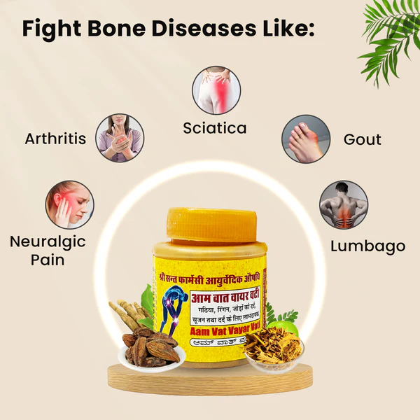 Aam Vaat Vayar Vaati is your ticket to pain-free joints and strong, flexible bones! Say goodbye to the stiffness of rheumatism, gout, sciatica, and arthritis, and welcome a life of ease and comfort. This powerful remedy tackles the root causes of bone disease, helping you move with confidence and strength. Why wait for the aches and pains to take over when you can prioritize your bone health today? Don’t let discomfort hold you back—feel the difference now!